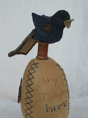 My Country home" is stitched to the side, as if done 200 years ago. Her wings are jointed with 100 yr old rusty overall buttons, the kind found on child's clothing.